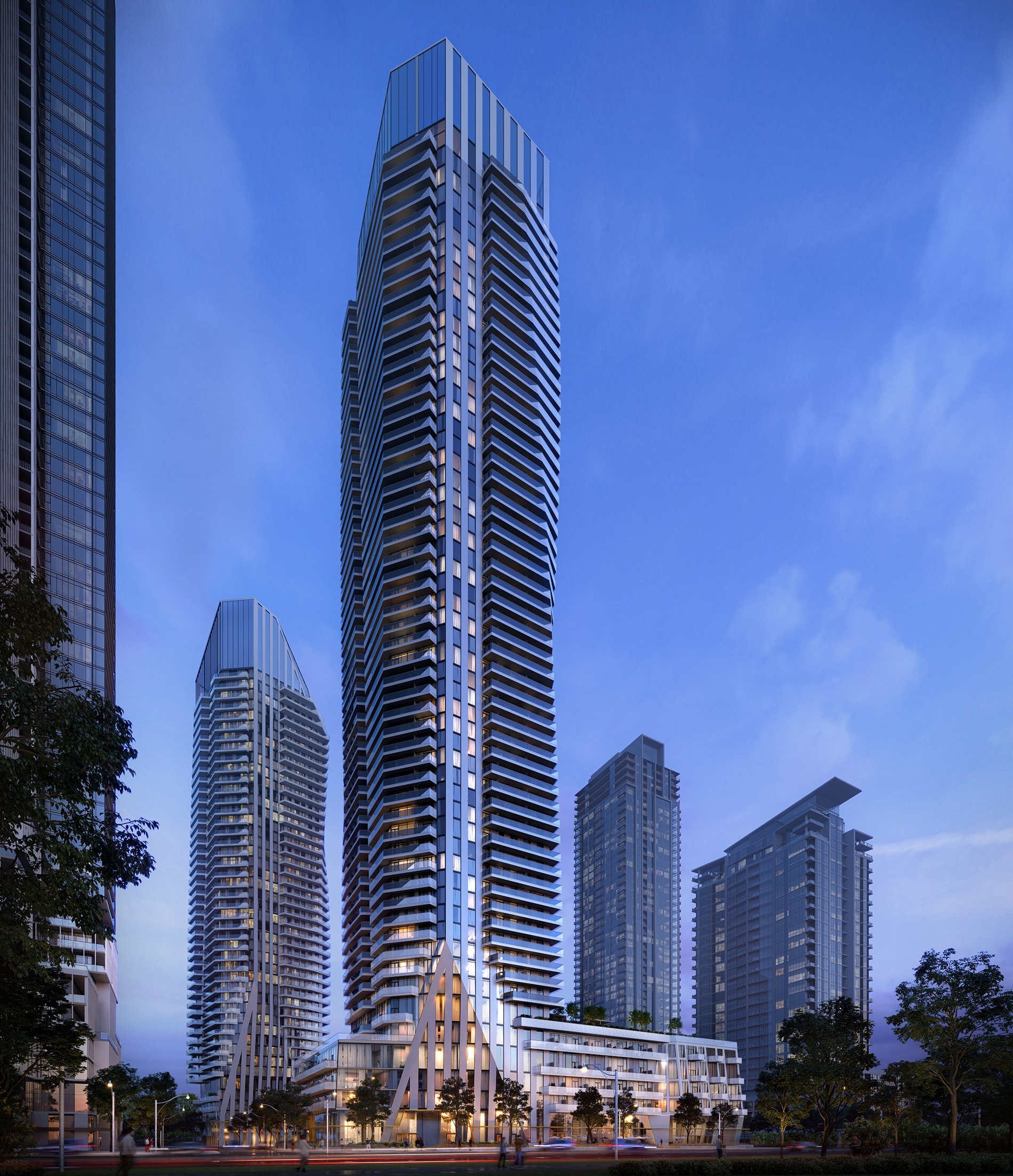 is punctuated by soaring vertical fins that come down to street level and frame the grand lobby