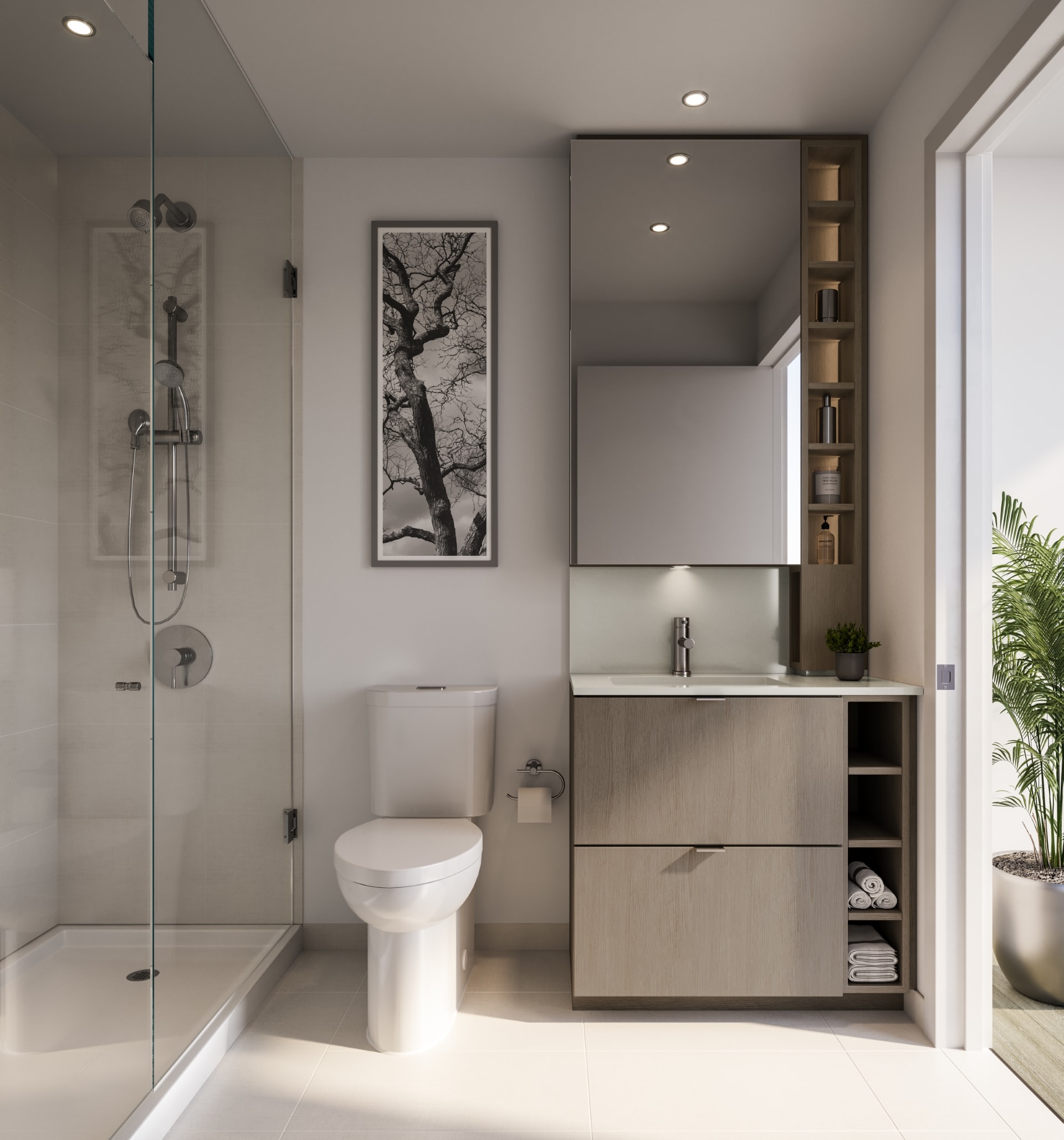 Custom-designed suite entry doors with contemporary hardware and smart door lock integrated with Rogers Smart Community**